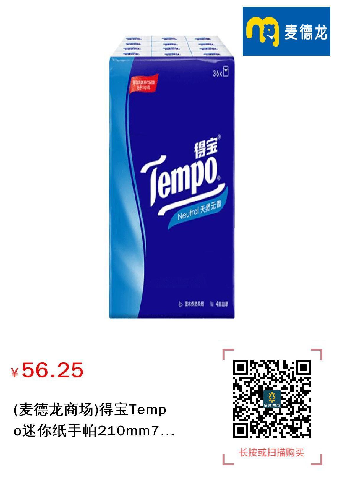 现金/积分 (麦德龙商场)得宝Tempo迷你纸手帕210mm7片共36包特惠装T0138D(天然无味) 147199