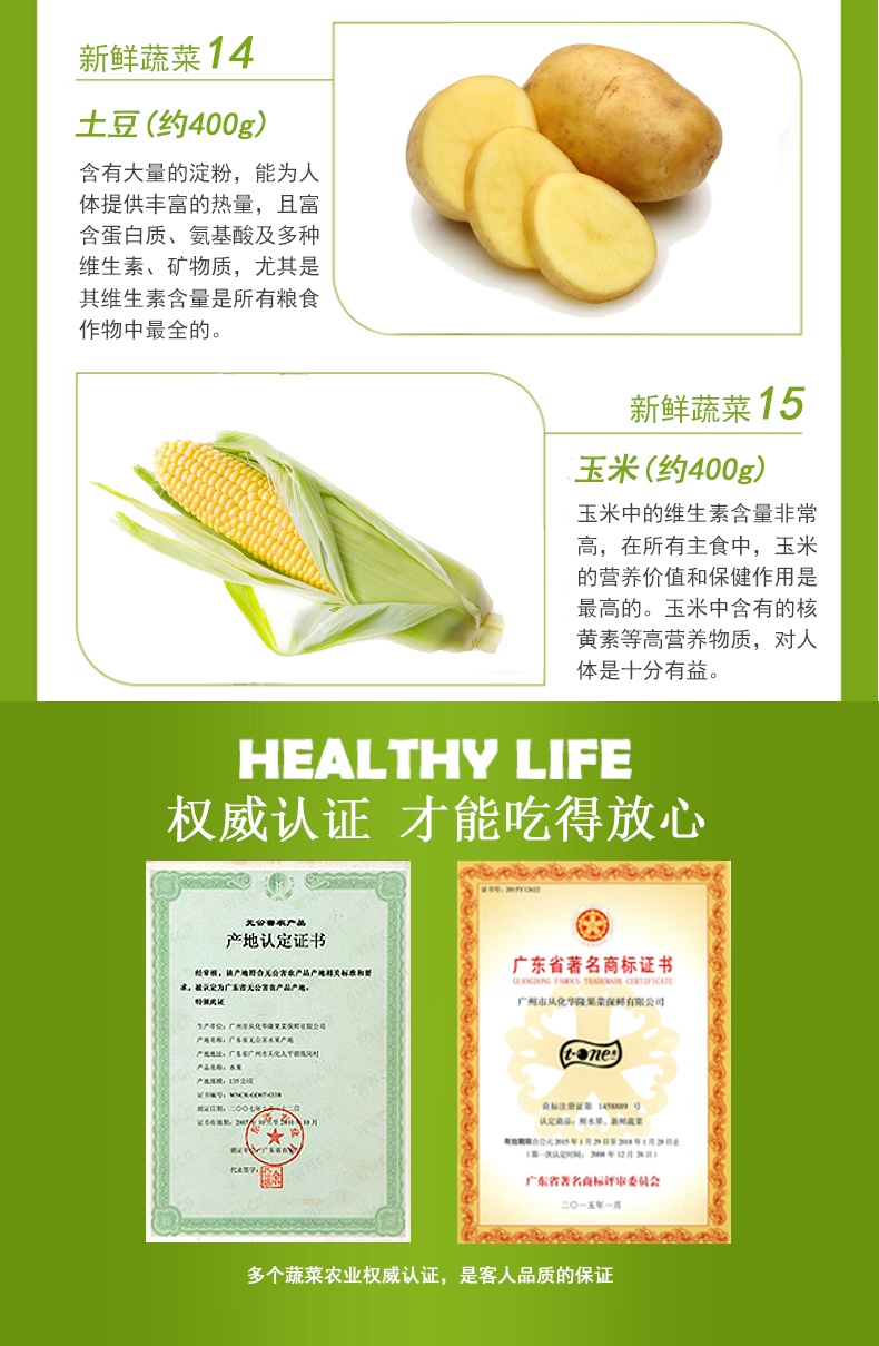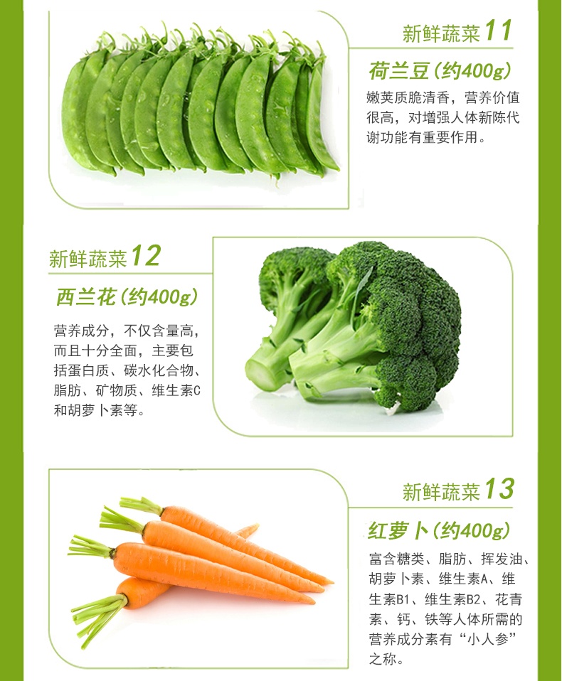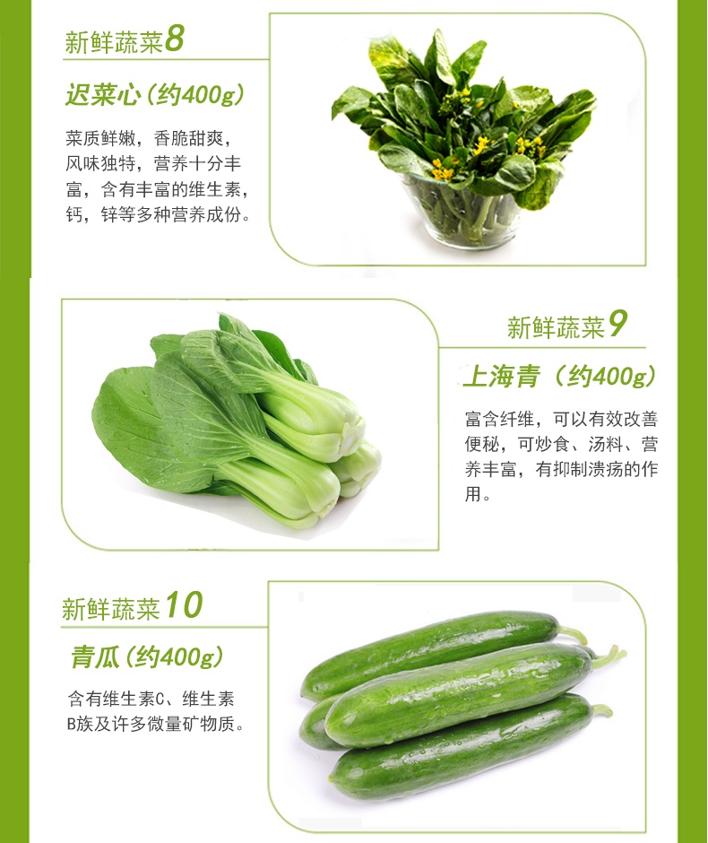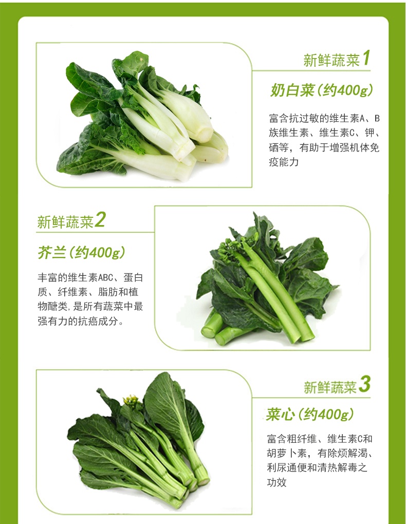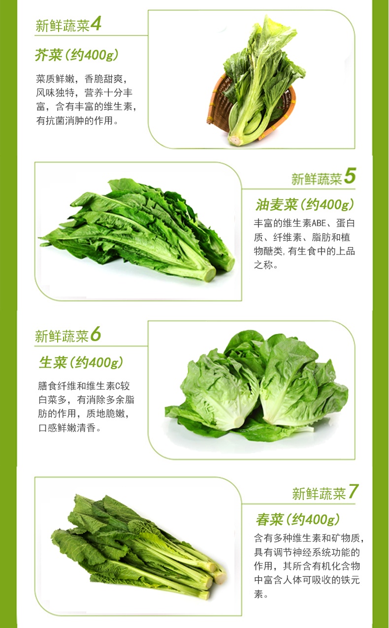套餐净重为3500~4000克,其中叶菜从以下中随机选择。菜心、上海青仔、奶白、芥菜、春菜、芥兰、迟菜心、生菜、油麦。