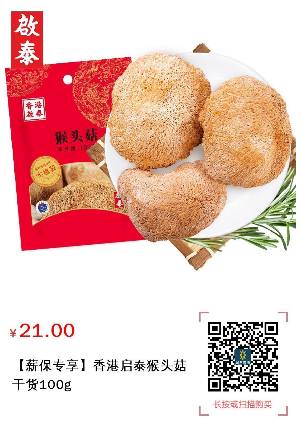 推广 【薪保专享】香港启泰猴头菇干货100g