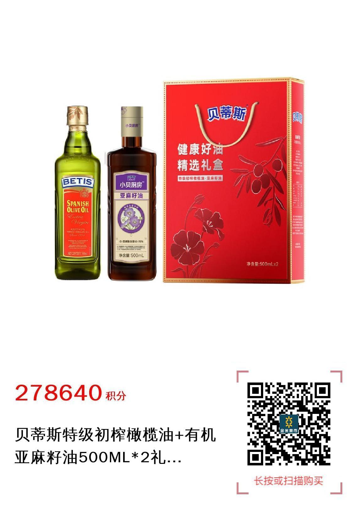 贝蒂斯特级初榨橄榄油+有机亚麻籽油500ML*2礼盒 贝蒂斯小贝厨房套装(积分兑换)