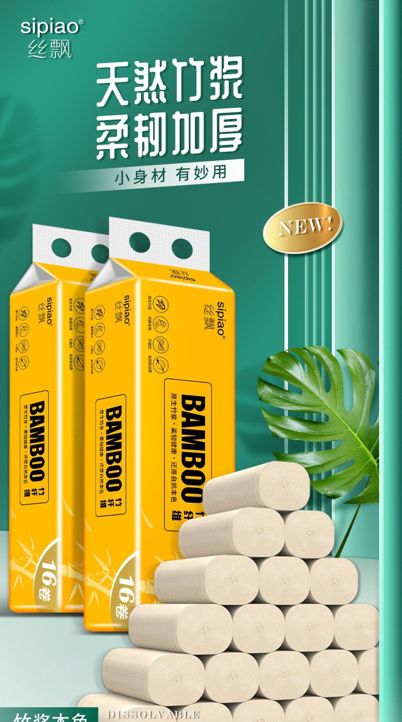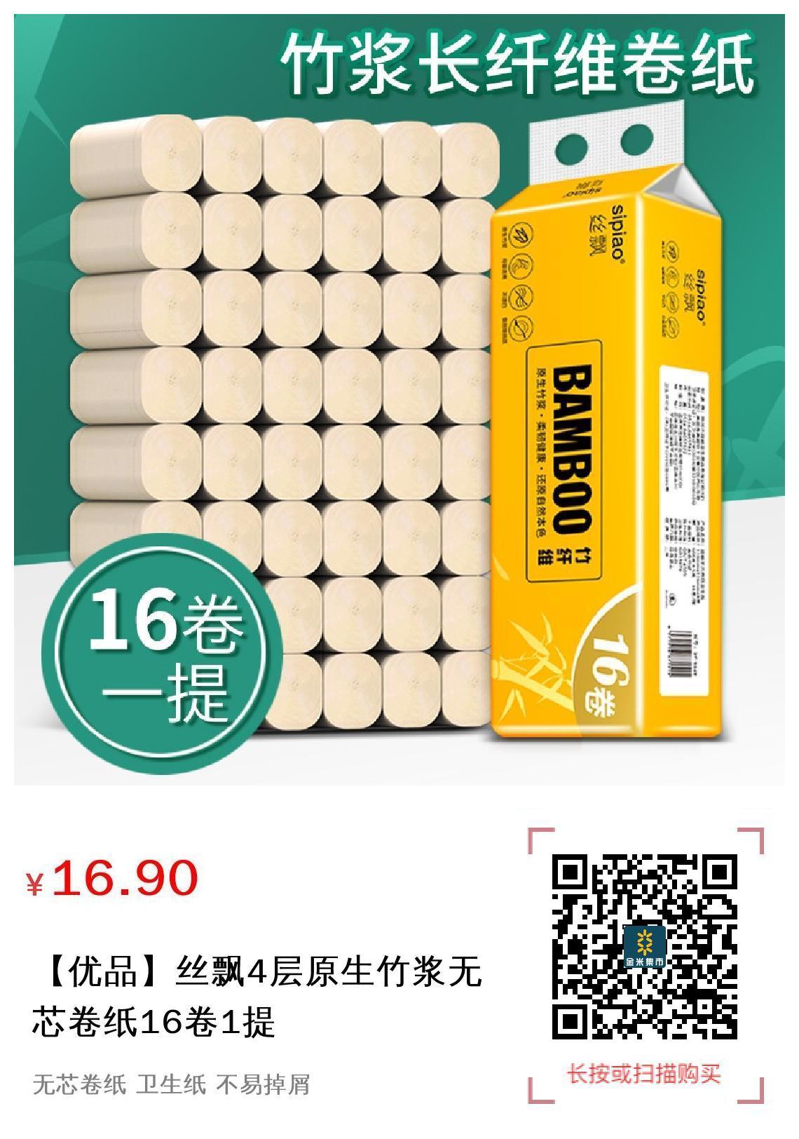 【优品】丝飘4层原生竹浆无芯卷纸16卷1提