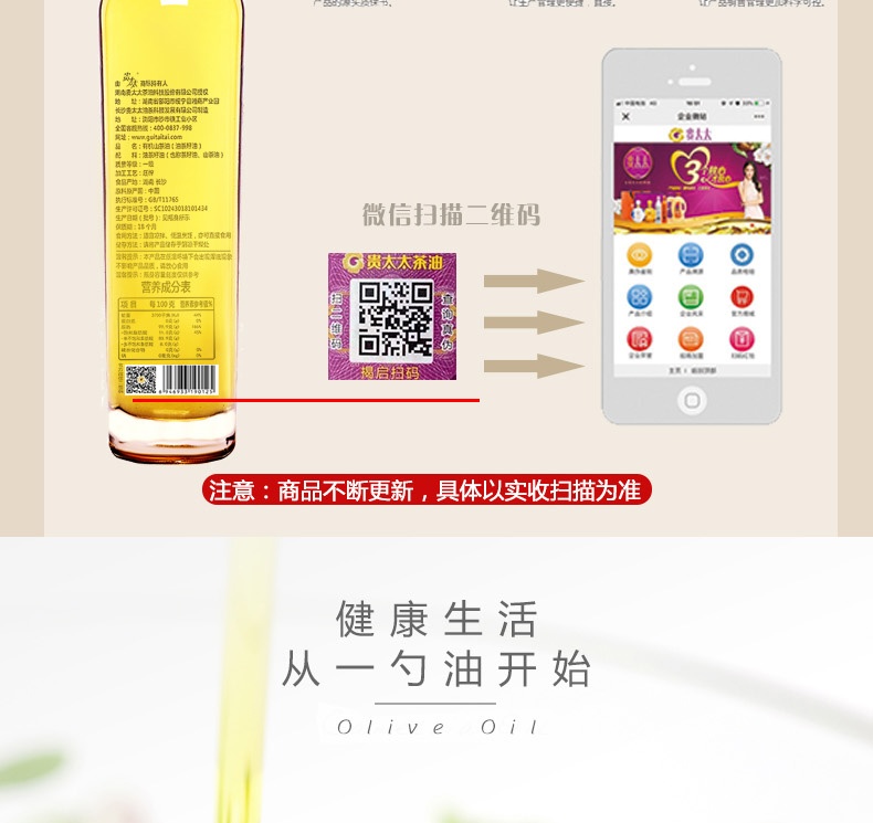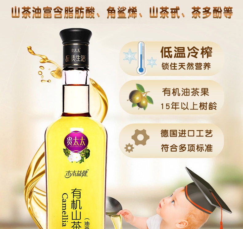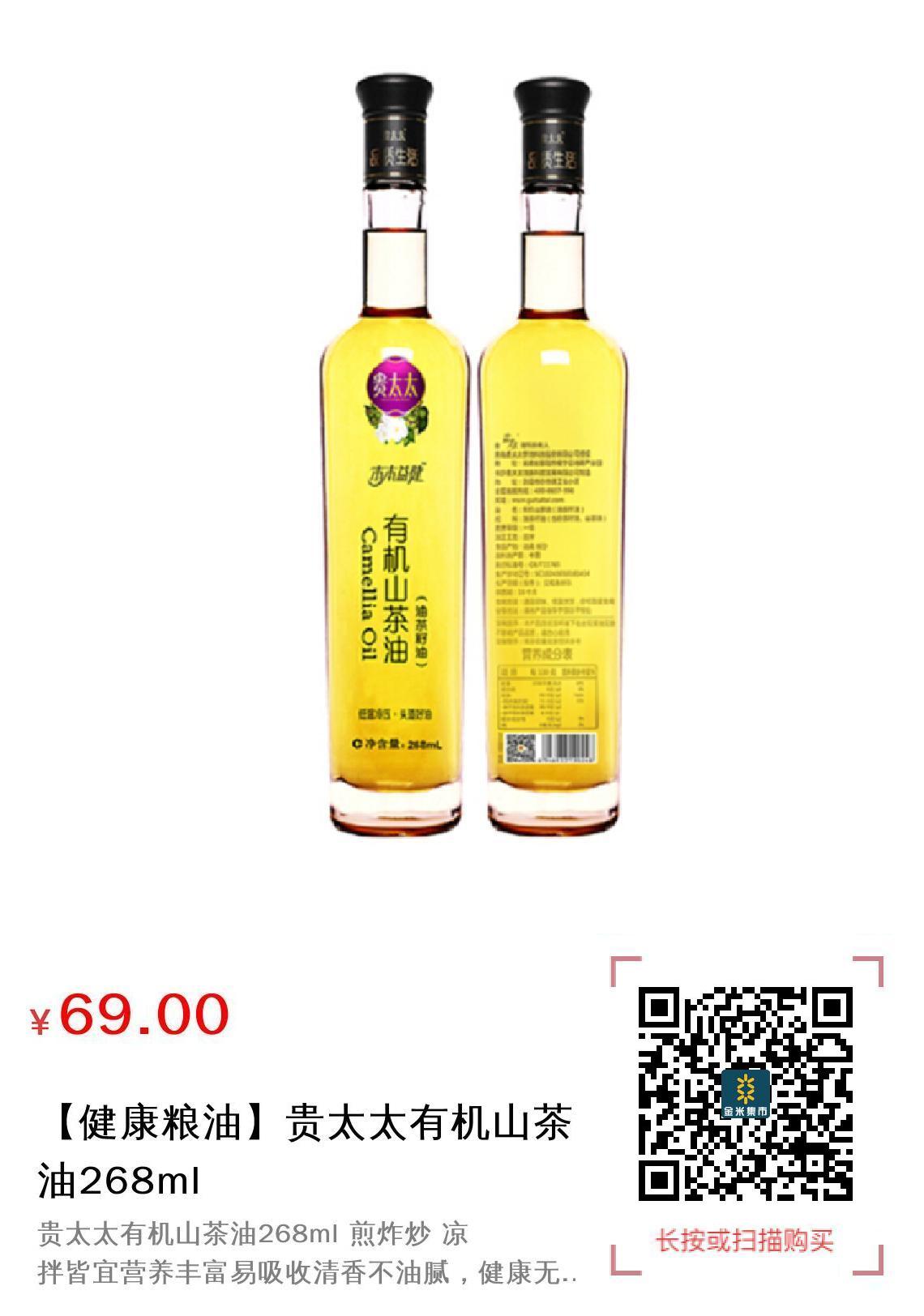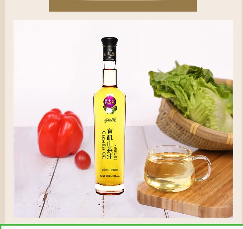 贵太太有机山茶油268ml 煎炸炒 凉拌皆宜营养丰富易吸收清香不油腻,健康无负担; 一油两用: 不仅可以食用,还可以外敷