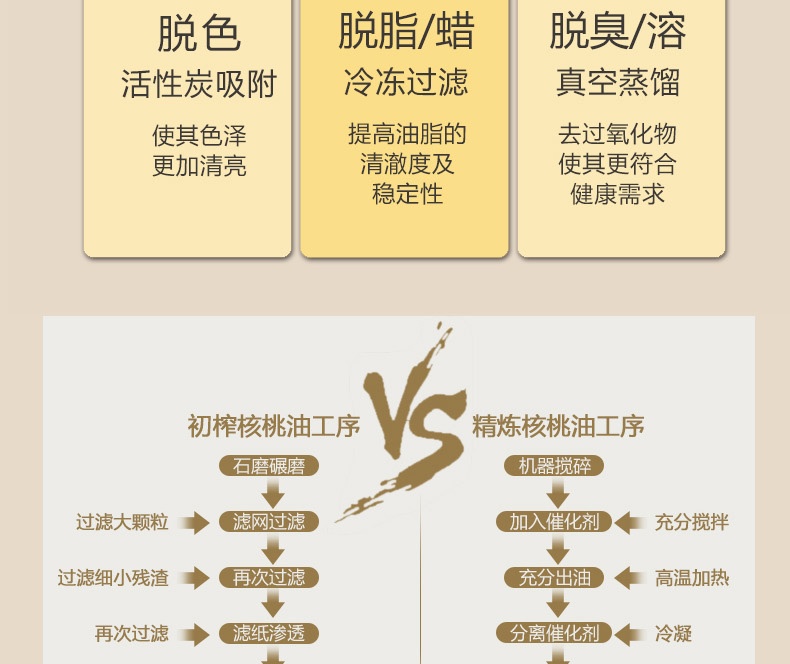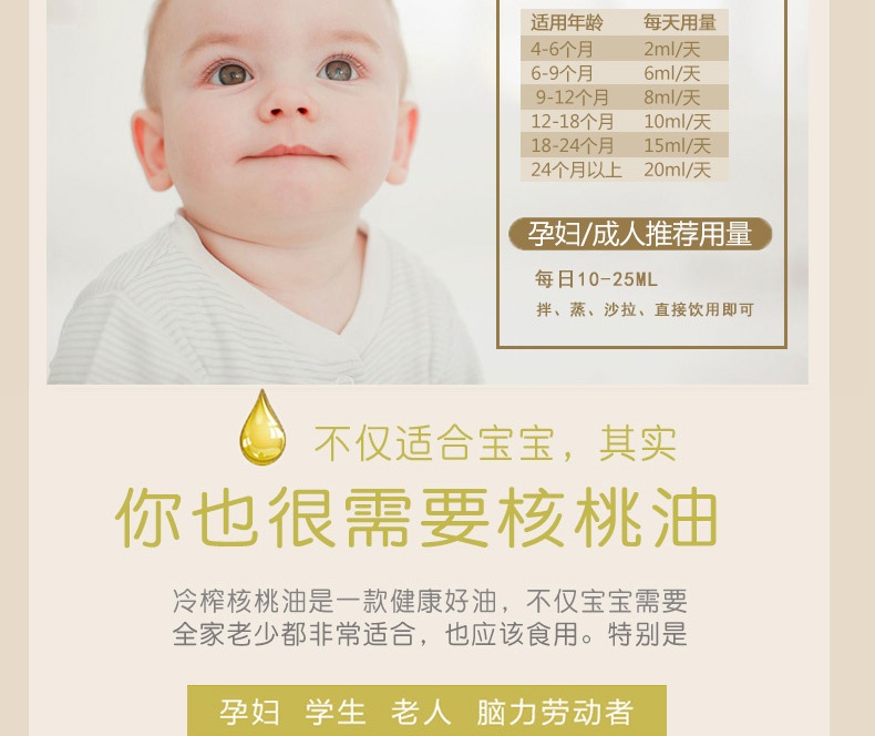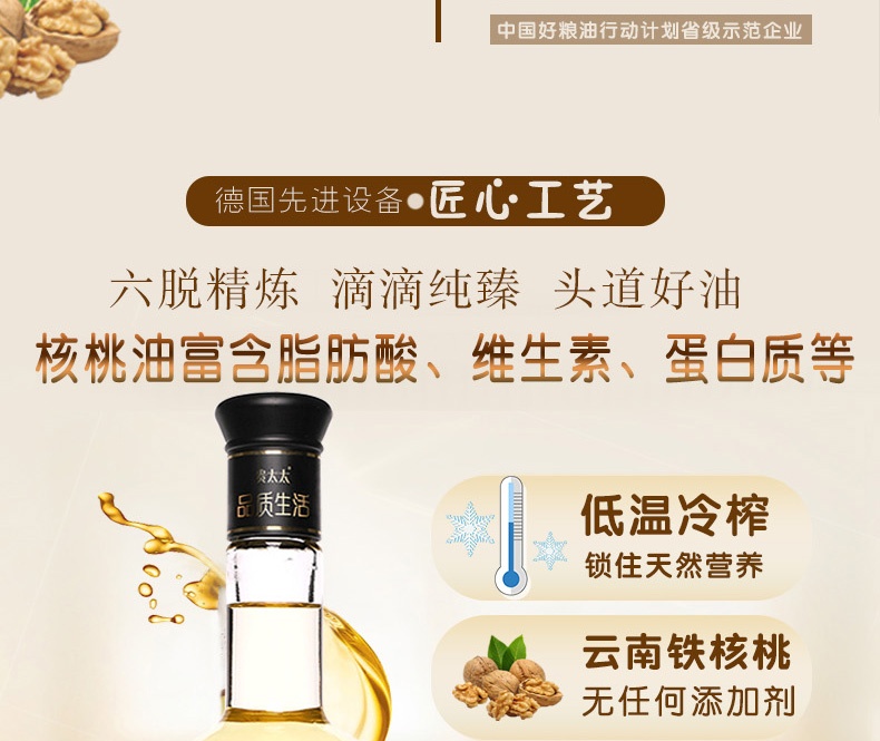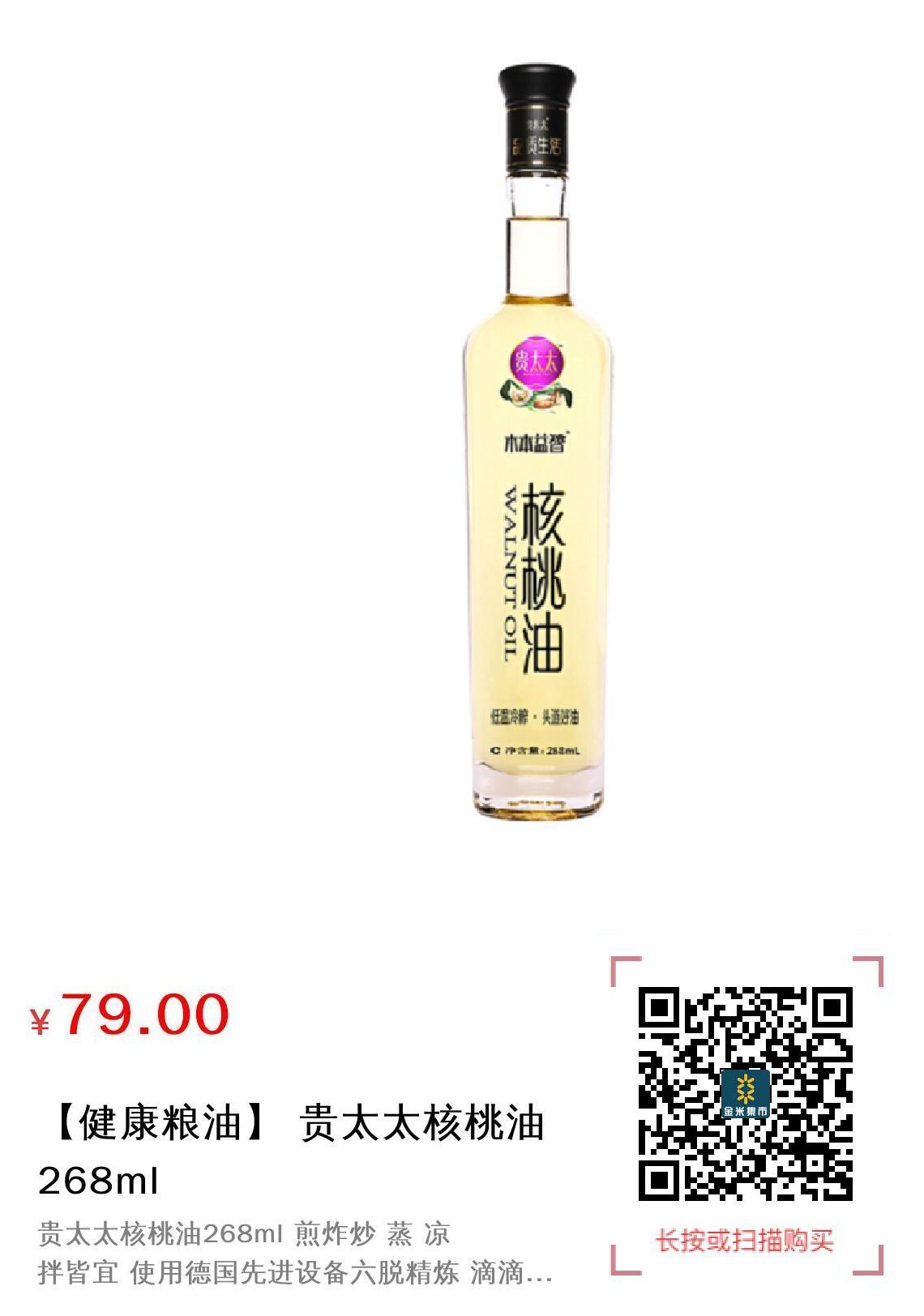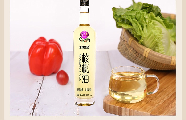 贵太太核桃油268ml 煎炸炒 蒸 凉拌皆宜 使用德国先进设备六脱精炼 滴滴纯臻 头道好油 核桃油富含脂肪酸、维生素、蛋白质。