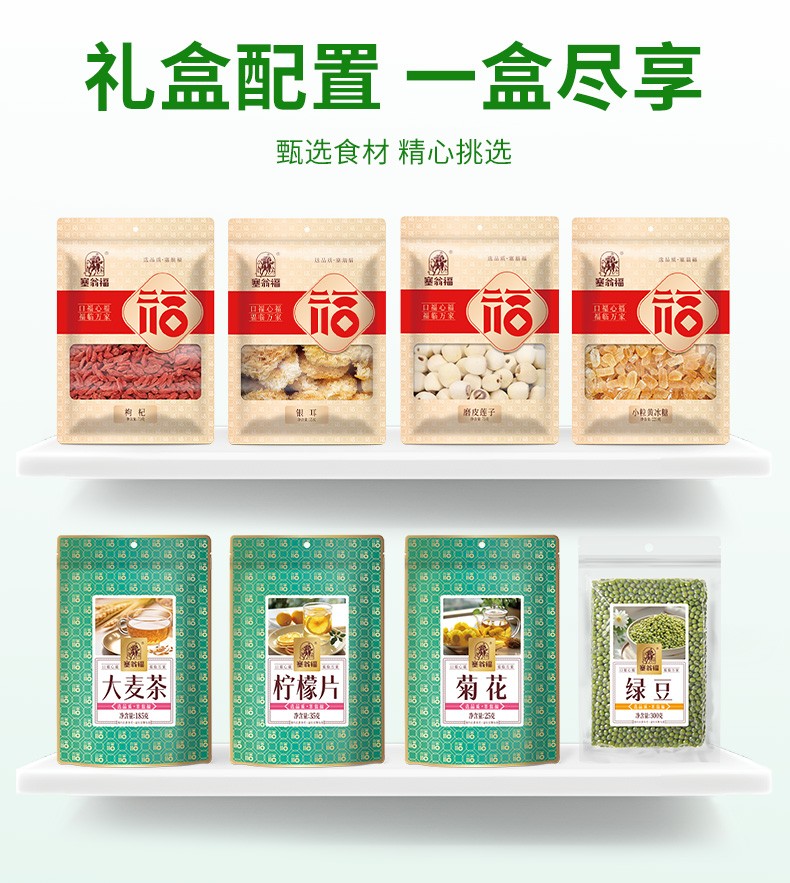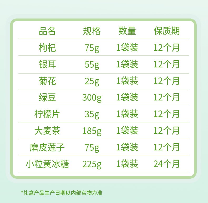 枸杞莲子银耳菊花柠檬片35g大麦茶185g绿豆300g黄冰糖225g