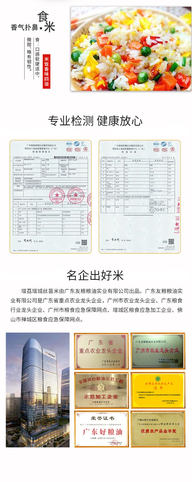 公司现有标准仓库6幢,筒仓16座,总仓容8万吨。公司在东莞、增城、从化拥有生产基地,年加工能力16.5万吨,并投资数百余万元设立高标准的粮食质量安全检测实验室,确保质量和安全。公司被广州市工业和信息化局认定为广州制造业骨干企业,中国粮食行业协会评为“全国放心粮油示范加工企业”“全国粮油加工行业大米加工企业50强”。