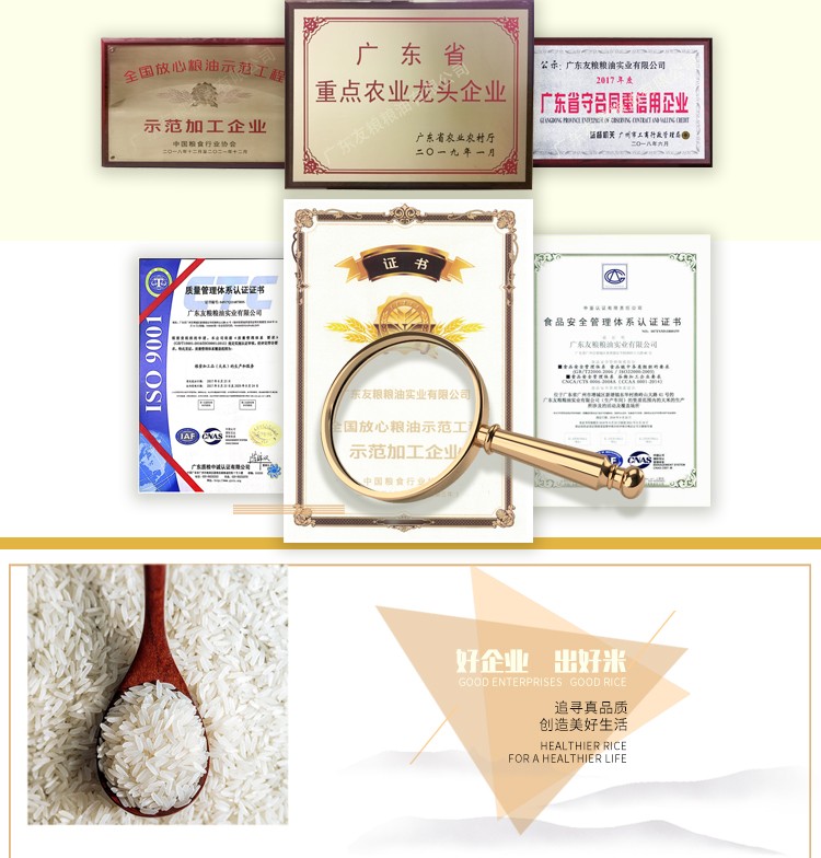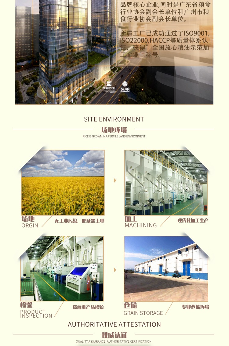 公司现有标准仓库6幢,筒仓16座,总仓容8万吨。公司在东莞、增城、从化拥有生产基地,年加工能力16.5万吨,并投资数百余万元设立高标准的粮食质量安全检测实验室,确保质量和安全。公司被广州市工业和信息化局认定为广州制造业骨干企业,中国粮食行业协会评为“全国放心粮油示范加工企业”“全国粮油加工行业大米加工企业50强”。