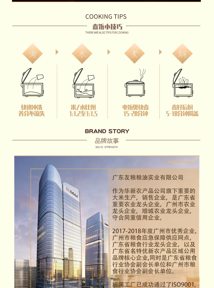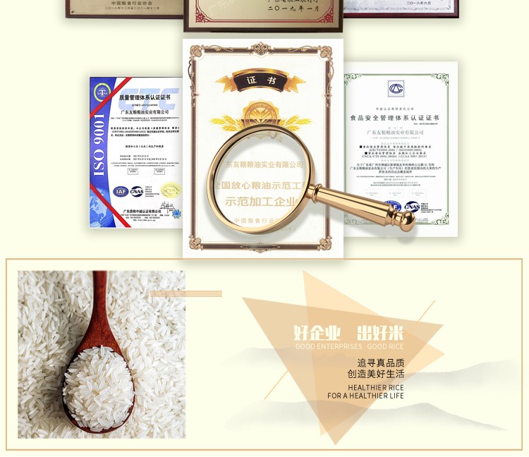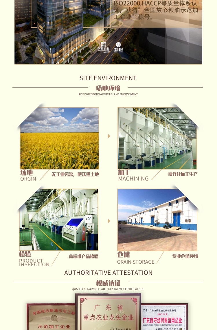 公司现有标准仓库6幢,筒仓16座,总仓容8万吨。公司在东莞、增城、从化拥有生产基地,年加工能力16.5万吨,并投资数百余万元设立高标准的粮食质量安全检测实验室,确保质量和安全。公司被广州市工业和信息化局认定为广州制造业骨干企业,中国粮食行业协会评为“全国放心粮油示范加工企业”“全国粮油加工行业大米加工企业50强”。