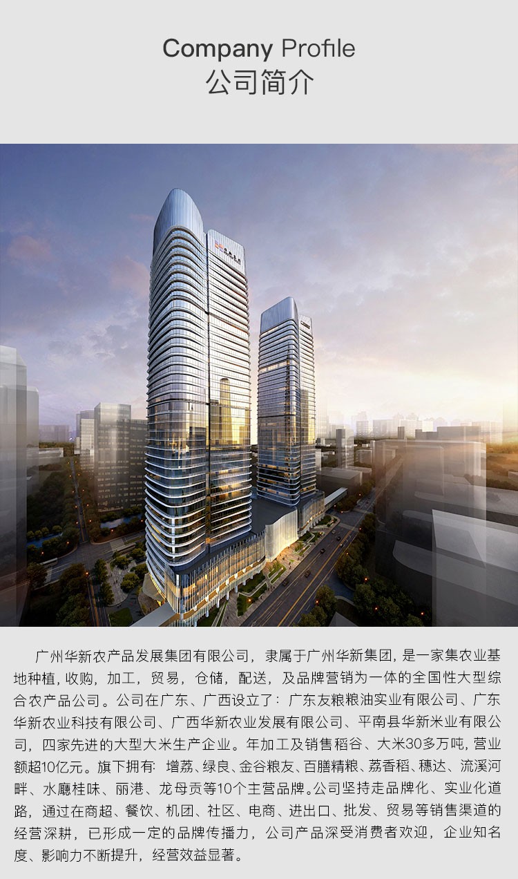 广东友粮粮油实业有限公司由中国服务业500强、广东省百强民营企业广州华新集团有限公司发起成立,是一家集农业基地种植、收购、加工、贸易、仓储、配送及品牌营销为一体的全国性大型综合农产品公司,是广东省重点农业龙头企业,广州市农业龙头企业、广东粮食行业龙头企业、广州市粮食应急保障网点、增城区粮食应急加工企业、佛山市禅城区粮食应急保障网点。公司年产值超10亿元,于2021年7月在广东股权交易中心挂牌,股权代码893037。