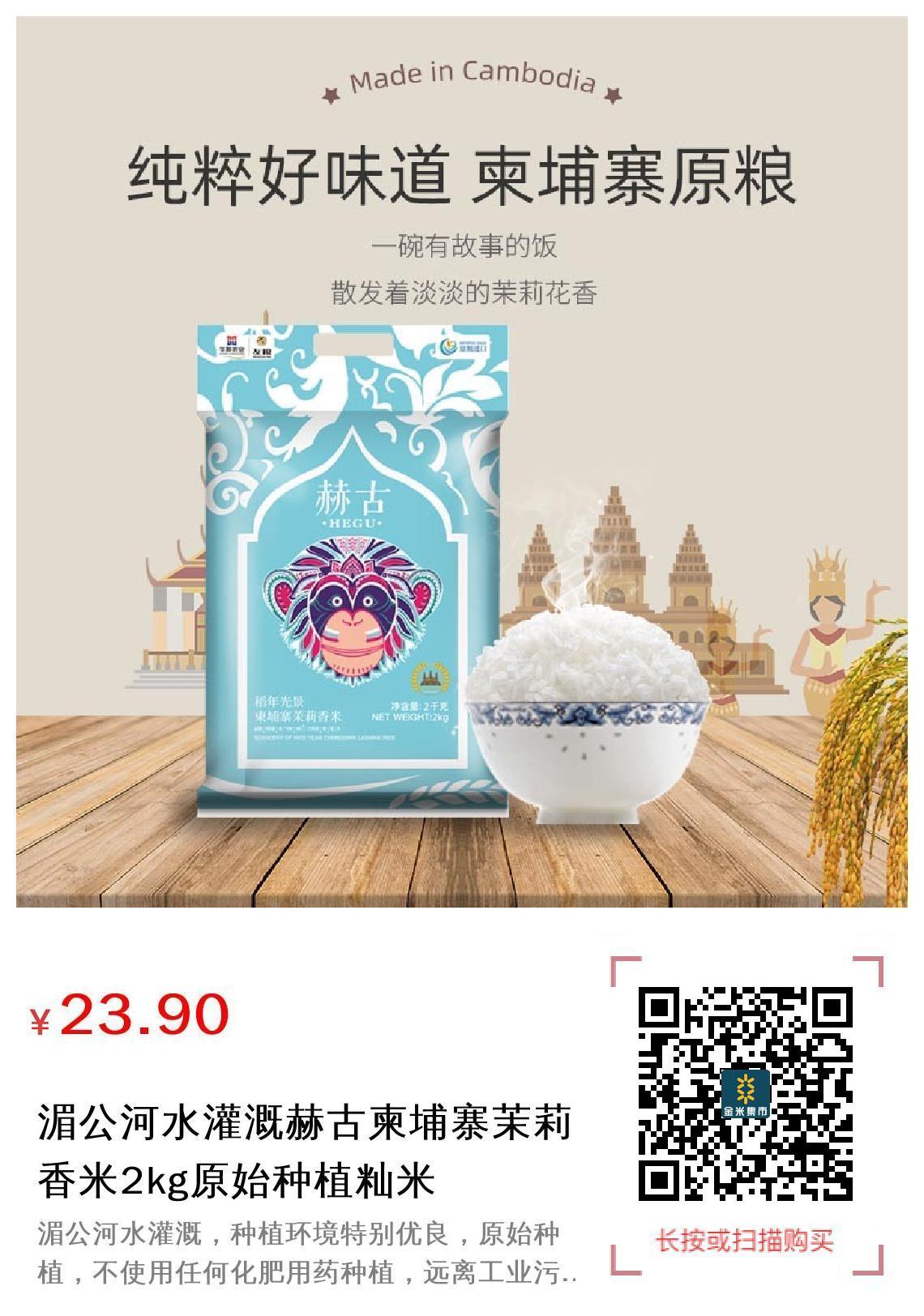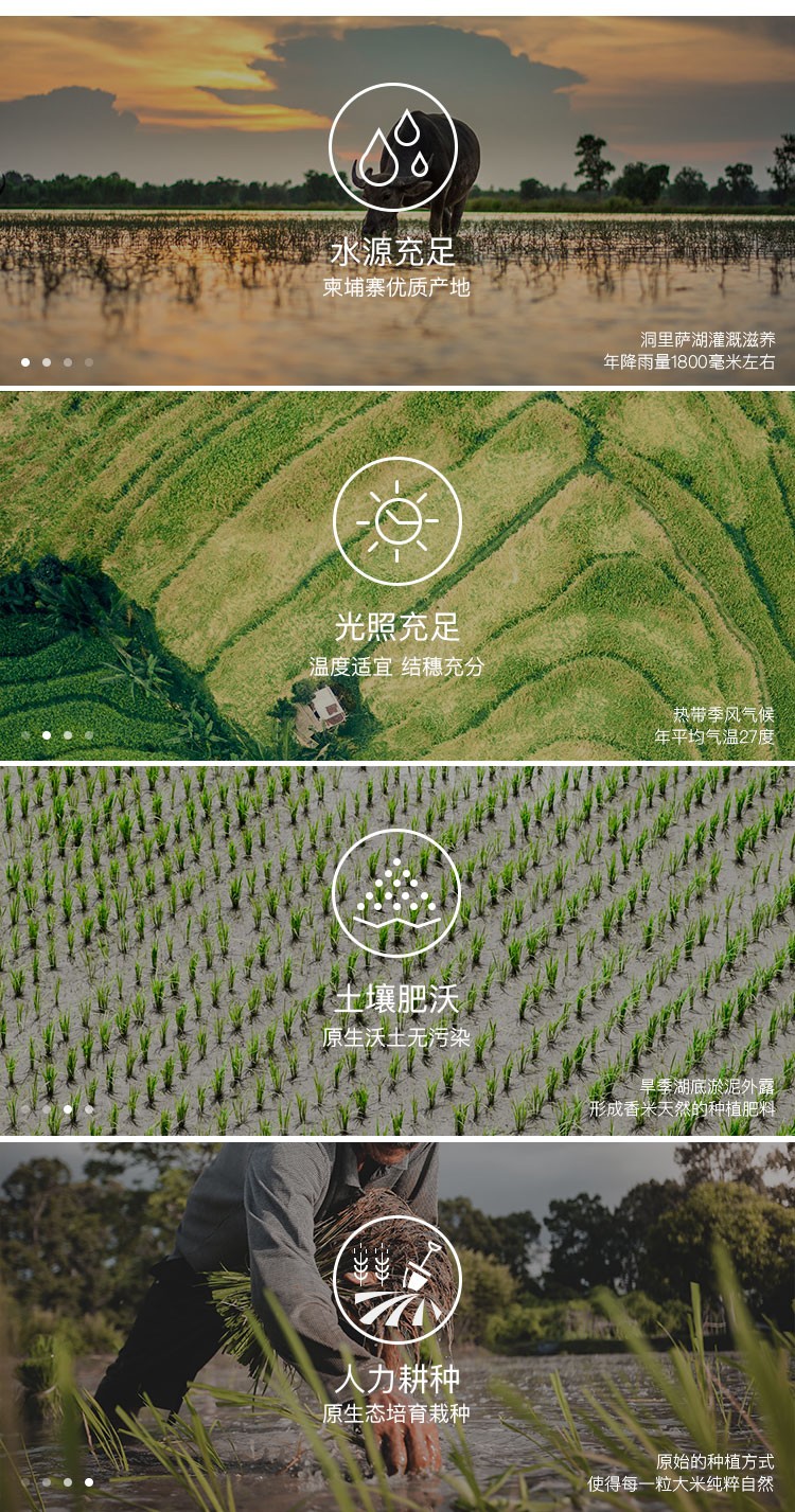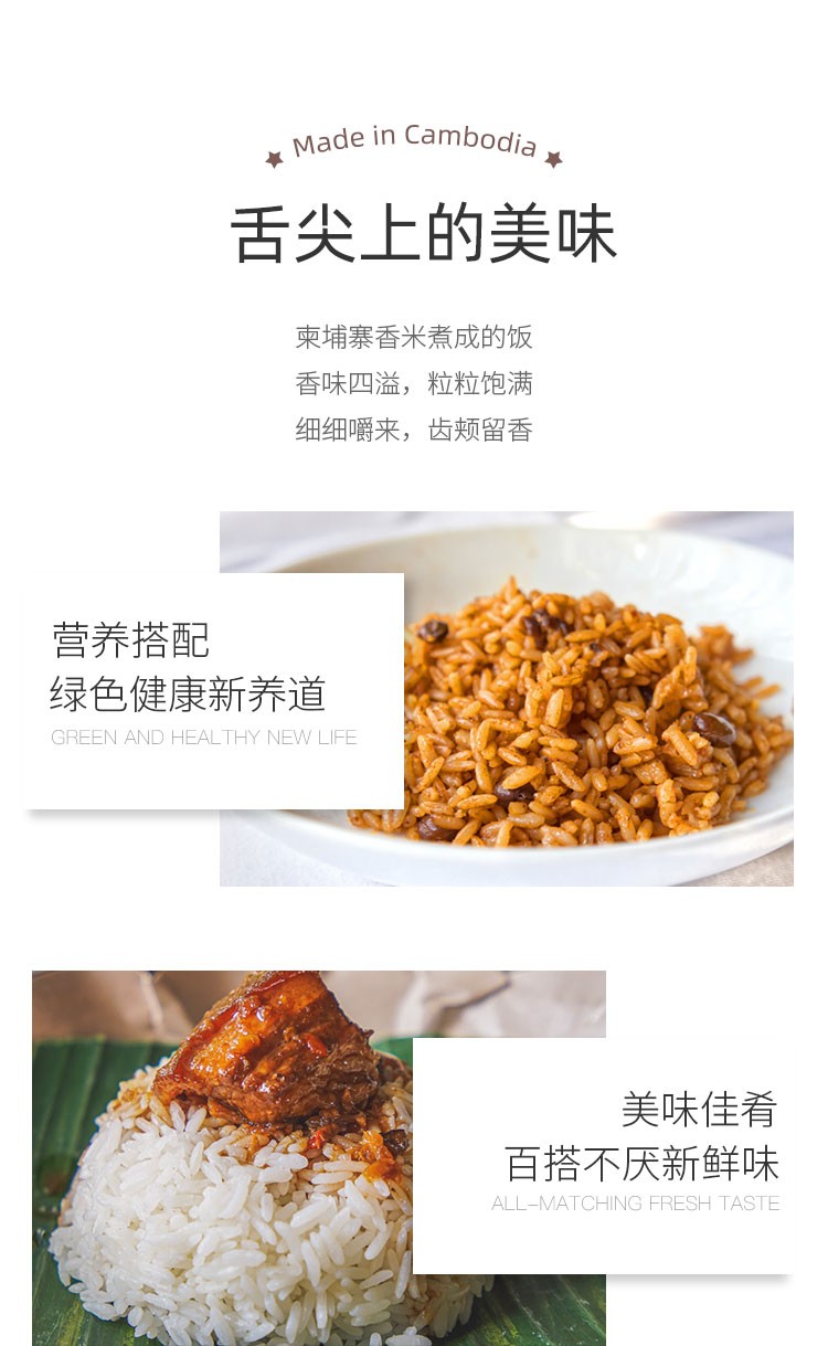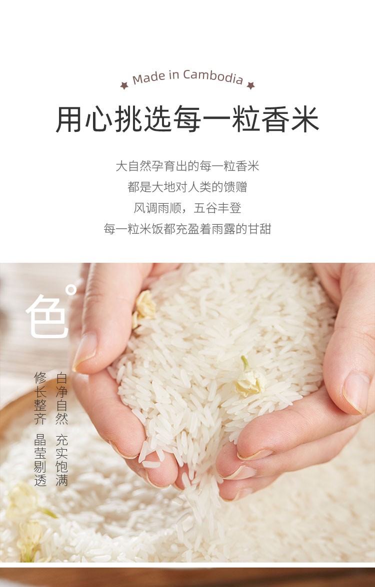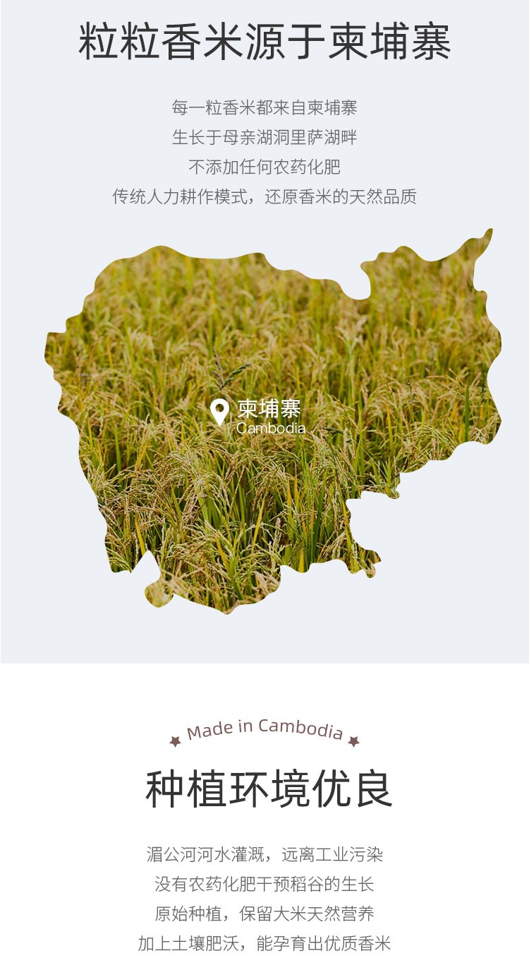湄公河水灌溉,种植环境特别优良,原始种植,不使用任何化肥用药种植,远离工业污染,柬埔寨原产地香米,回头率超高,淡淡茉莉香,香而不黏