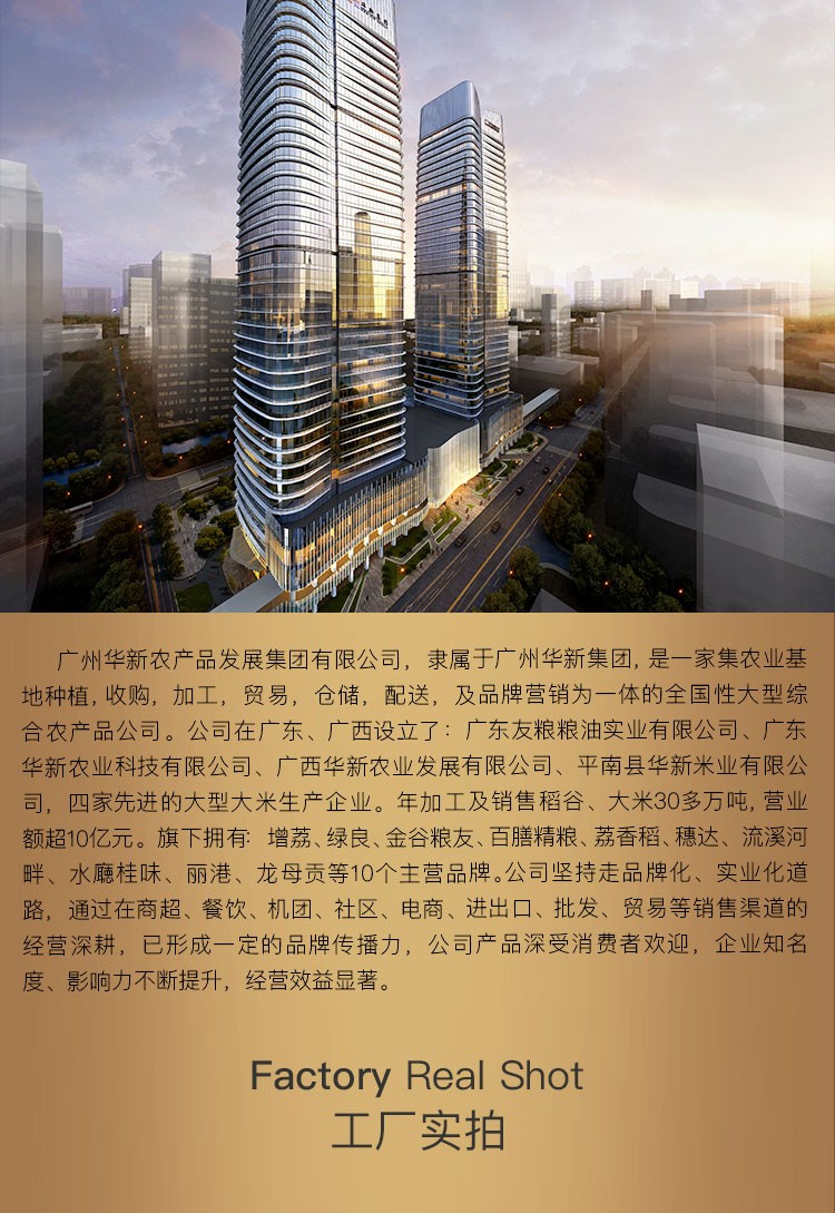 公司现有标准仓库6幢,筒仓16座,总仓容8万吨。公司在东莞、增城、从化拥有生产基地,年加工能力16.5万吨,并投资数百余万元设立高标准的粮食质量安全检测实验室,确保质量和安全。公司被广州市工业和信息化局认定为广州制造业骨干企业,中国粮食行业协会评为“全国放心粮油示范加工企业”“全国粮油加工行业大米加工企业50强”。
