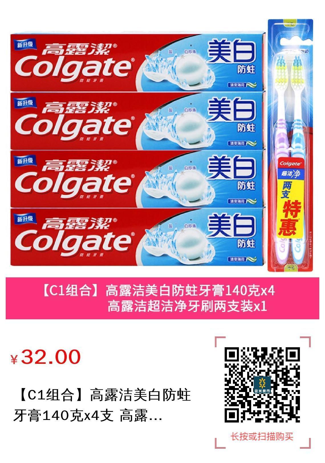 【C1组合】高露洁美白防蛀牙膏140克x4支 高露洁超洁净牙刷两支装