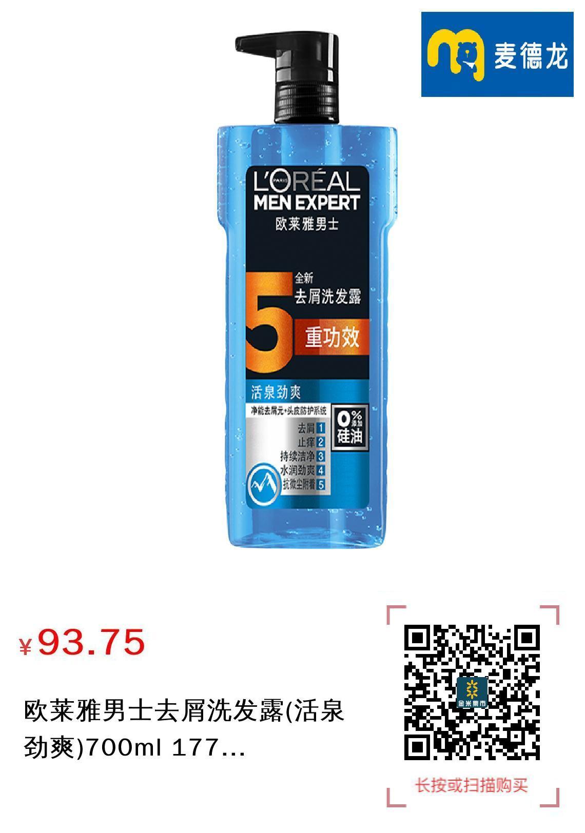 现金/积分 欧莱雅男士去屑洗发露(活泉劲爽)700ml 177152